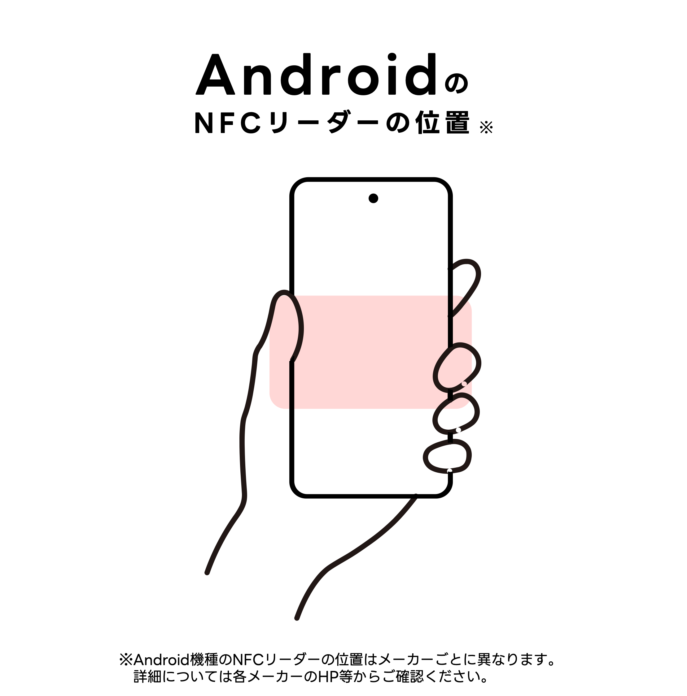 NFCリーダーは機種により位置が異なります。Androidは中央付近が一般的です。