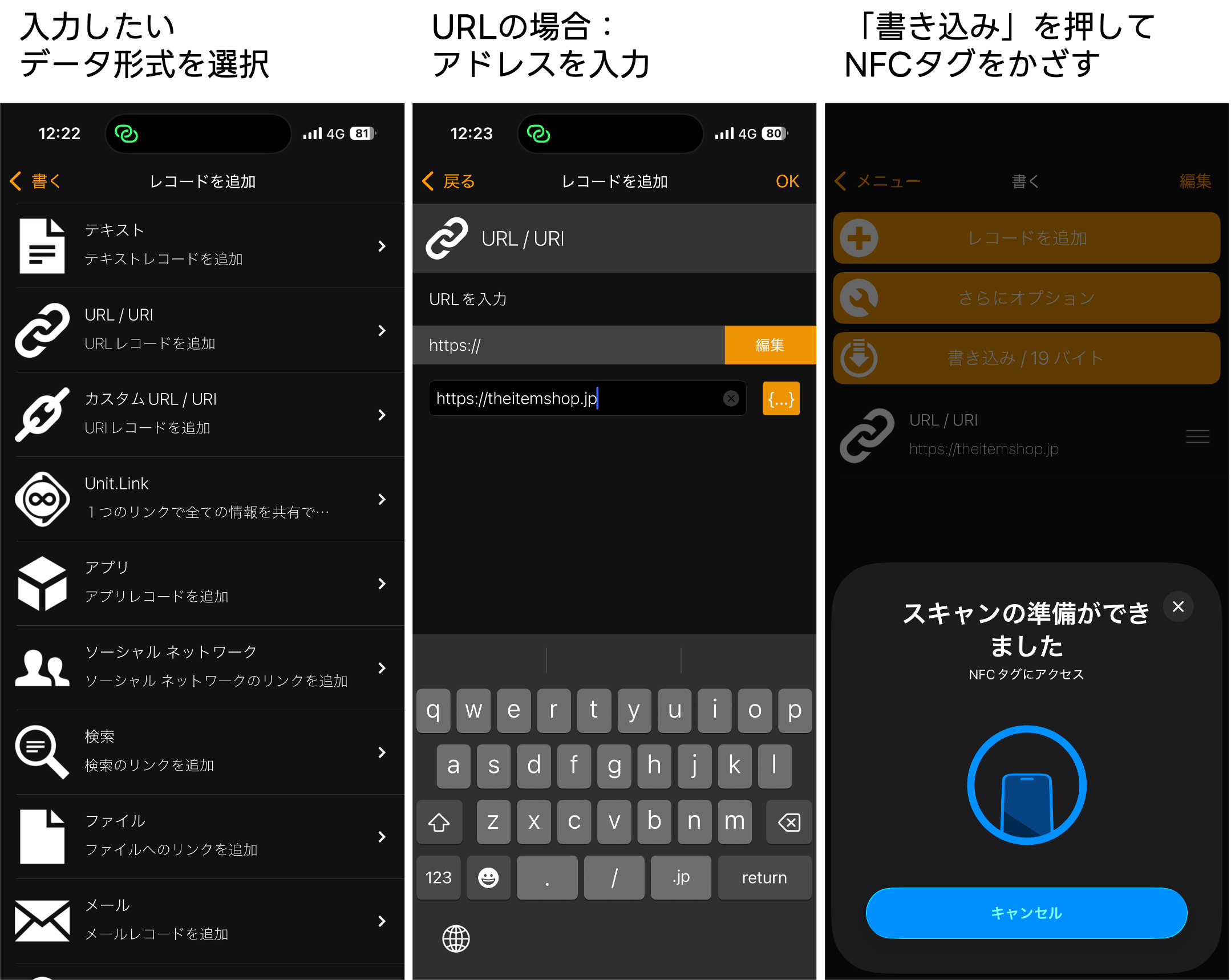 アプリを開き「書く」を選び、URL・テキスト・Wi‑Fiなどを書き込み対象を選択データ入力