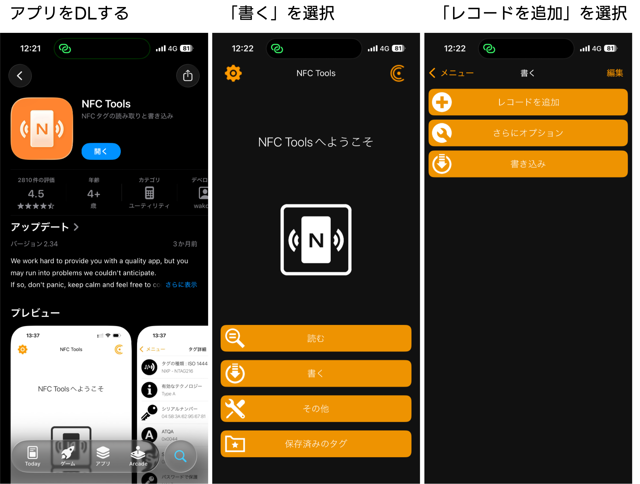 App Storeで「NFC Tools」などのNFC編集アプリをインストール起動と設定